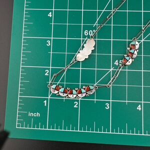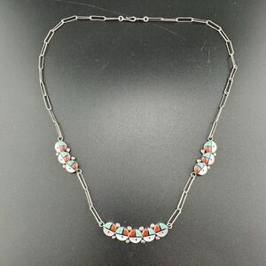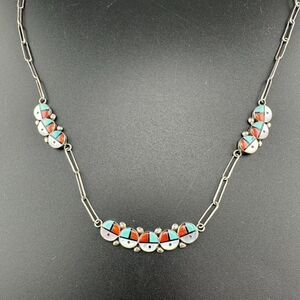 Vintage Zuni Sunface Sterling Silver Turquoise Inlay Sun Face Necklace. Good condition, light expected tarnish. Necklace is 16". I believe the stones are turquoise, mother of pearl, possibly coral and onyx.