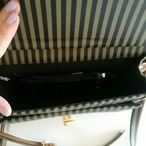 Striped purse with hand strap and detachable, adjustable cross-body strap. Cognac details. Opens with small pocket on the inside and slim front pocket. Gold details. In great shape!