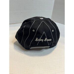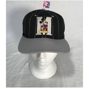 This vintage snapback hat features a classic Mickey Mouse design on a black pinstripe background, offering a playful yet refined style. With its adjustable snapback closure and one-size-fits-all fit, it is a versatile accessory, providing comfort and style for casual outings or themed events.