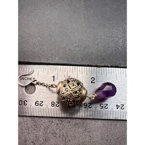 Genuine purple chevron faceted brioliottes hanging from the bottom of what appears to be brass spheres encrusted with mercasite gemstones. Stung onto a gold tone chain with sterling silver ear wires. Please note I couldn’t find any purity stamps on the silver or other metals but there were obvious signs the ear wires are sterling silver. I acid tested the ear wires and verified purity of at least 92.5% silver . ( 925 sterling silver). As far as I can tell these are the only part that are made of sterling. Unsure of age and maker. Possibly artisan crafted. Total weight is 13.73 grams.