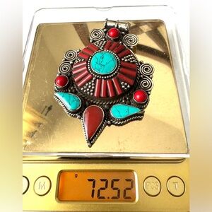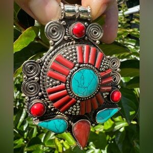 Vintage pendant,Tribal theme,handcrafted,handmade,tibetan silver,coral and turquoise,3.5”inch tall,72grams,Made by skilled artisan from Himalaya,Tibetan jewelry Himalayan jewelry,(note) listing price is for per pendant) Great piece to add with your pendant collection from Himalayan region.Thanks