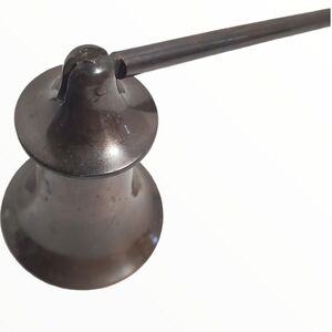 Vintage antique finish dark Metal candle snuffer Long handle. Has some discoloration on the inside of the Bell. Handle is 12". Bell is 2.5" tall.