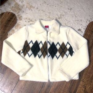 Vintage argyle fuzzy cropped cream jacket 90s collar full zip classic Y2K M boho