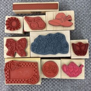 Stamps show normal wear, wooden blocks have some price stickers or personal markings on some. Stamps are clean without damages, stored properly & ready to create with.