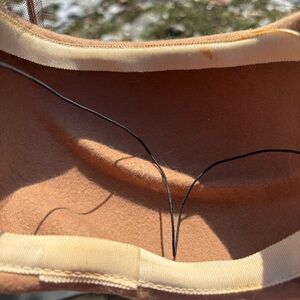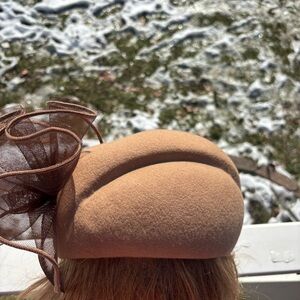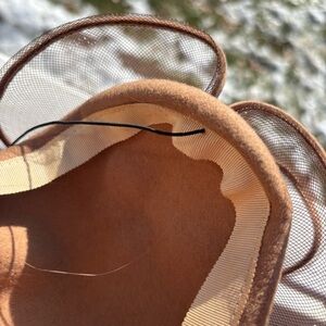 Vintage avant garde partial hat tan mesh ruffle wool fascinator hat with chin strap. Smoke free. Measurements are approximate. No modeling or trades.