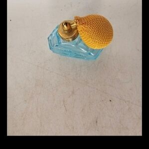 Here is a vintage azure blue perfume bottle with an atomizer , it has embossed flowers on it and it's in great condition. by I.W. Rice from Japan