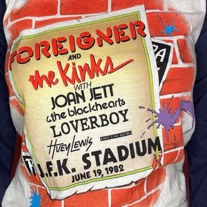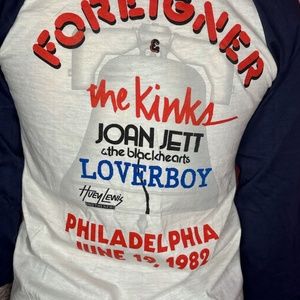 Baseball T-shirt sold for Foreigner's concert at JFK Stadium 1982. Official merchandise item from the time. Never worn, size Small ft. The Kinks, Joan Jett and the Blackhearts, Loverboy, Huey Lewis