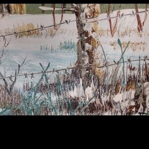 Vintage barnscape painting by Everett Woodson. This piece is in excellent condition.