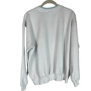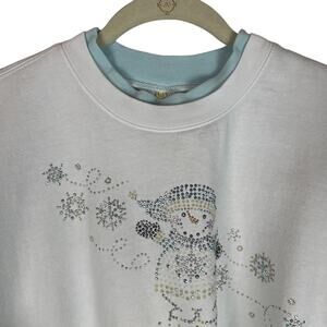 Fair preowned condition, please note this has some minor wash wear and there are stains on the back of the sleeves, shown in last pic, 60.5% cotton, 39.5% polyester, white with contrasting blue collar, jeweled Snowman