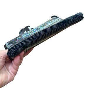 Vintage 1990's beaded evening bag done in black with multicolor iridescent finish and abstract shimmering light colored horizontal bead lines. Black satin lining - this purse is a shoulderbag style with braided bead strap and zipper top. Bag is NEW old stock - tagged Tano and probably from the 1990's - in excellent condition with no damage or flaws. Just stunning and perfect for your next dressy event!