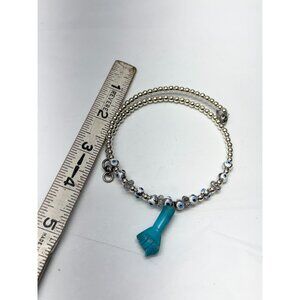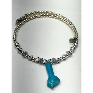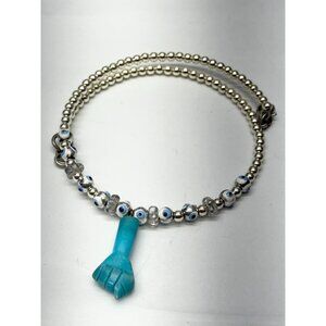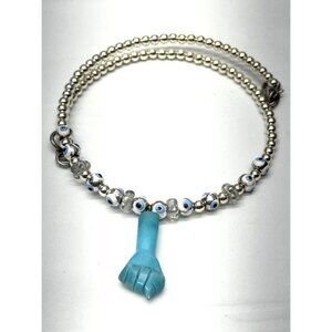 Vintage beaded evil eye stone figa hand collar necklace. Collar necklace beaded on wire with hanging blue figa hand stone charm and evil eye beads. Silver tone. NM52GF.