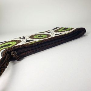 Vintage beaded zip clutch Retro brown, green, white circle motif handbag wallet