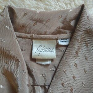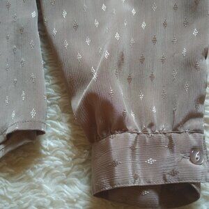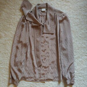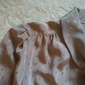 Vintage 70s polyester lavalliere blouse by Pykettes. Pussybow. Color is dusty pinkish beige neutral with monochrome shimmery diamond print. 3 ties to create knotted neckline. Long sleeve. Button front and cuff buttons match color of shirt. Machine wash and dry. Silky feel polyester. Perfect condition. Size tag faded. Fits like Medium