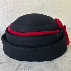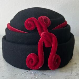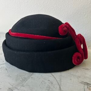 Vintage beret felt Pill box hat velvet accent black and red 40s 50s retro rare
