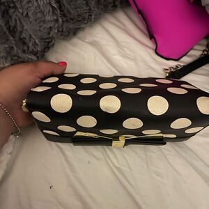 Black & cream white polka dotted leather w/goldtone metal bow accent w/signature logo on bow & zipper pull - interior has 16 card slots & lg middle pocket & has grafetti/scribble inner fabric