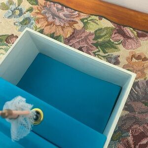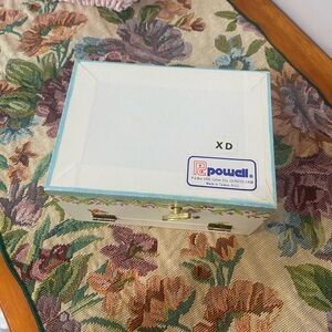 Charming vintage big eyed girls jewelry box featuring a floral design and playful children. Made in Taiwan. Perfect for storing small treasures. 1970’s I’d guess. Pristine! Has original tag and warranty inside. Small area inside the blue bottom is lifting slightly. Plays somewhere over the rainbow.
