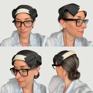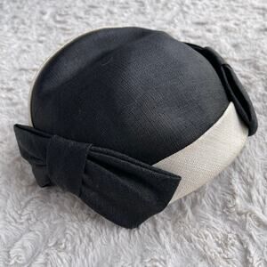 Vintage black fascinator hat bow black cream. Some indentations at the crown while at rest, but they straighten out with wear. Will need bobby pins or similar to keep it secure on the head. No markings.