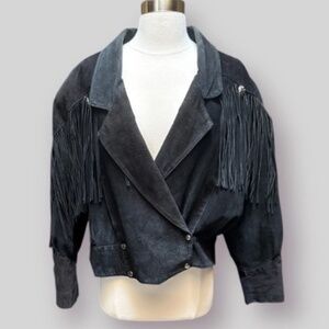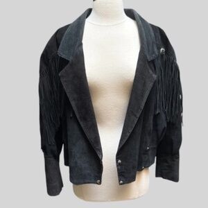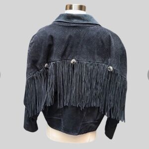 80s leather fringe jacket. Featuring a croc like print and padding on shoulders. 4 snap buttons. Hidden front pockets. Does show some slight wear. Still in great shape. Would fit a medium best.