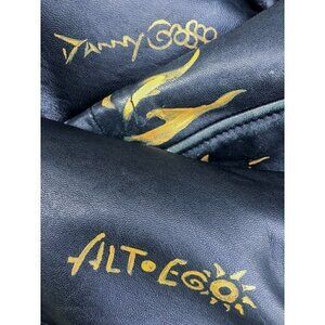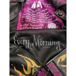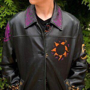 Vintage supple black leather hip-length jacket with tangerine, fuchsia and gold hand painted images. Original, one of a kind wearable art. Gypsy, boho meets biker, alto ego, flames, fire mystic vibe.
