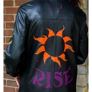 Vintage black leather jacket, tangerine sun, fuchsia, hand painted, unique