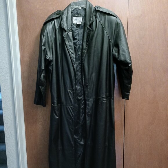 The coat is a full-length black leather trench coat featuring a collar, button-down front closure, and deep front pockets. The leather is soft, possibly lambskin, in a classic structured silhouette from the 1980's.