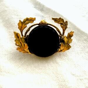 Vintage black onyx, leaf brooch, gold tone wreath pen with black cabochon.