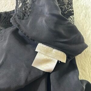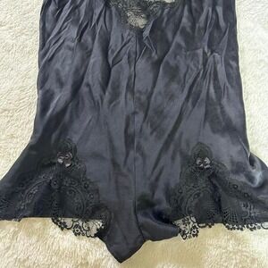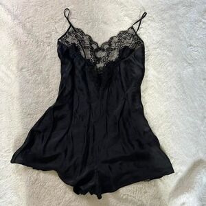 Black lace satin vintage lingerie with lace and ribbon detail, black slip romper with lace trim. Perfect to wear under garmets or as a standalone top! Vintage Patricia fieldwalker Adagio gold label lingerie slip bodysuit.