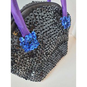 The purse has black sequins with cobalt blue sequins trim and deep purple strap handles. There is a zipper closure and one inside pocket