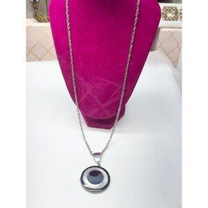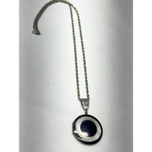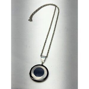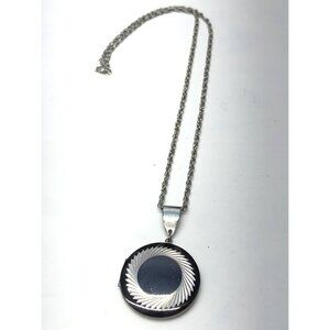 Vintage black silver locket pendant necklace. Silver tone chain with hanging silver and black locket. Locket opens and closes with ease and stays closed. Vintage necklace. MN53FH.
