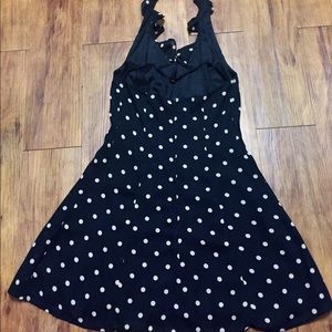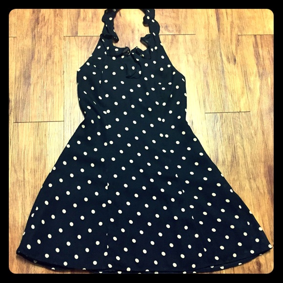 Very well taken care of vintage Blondie and me rockabilly halter dress. Black & white polkadot dress with ruffled halter. This dress looks amazing on and flares out perfectly. Size 3. From back zipper lengthwise approximately 23" & approximately 14" wide