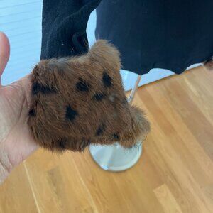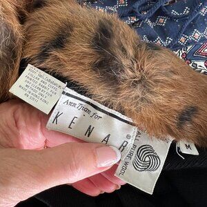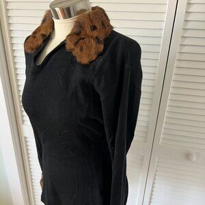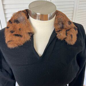 Ann Tjian for Kenar brand vintage black wool sweater with rabbit fur printed collar and cuffs. Collar is missing a button closure.size medium