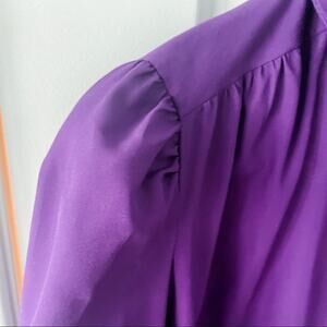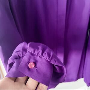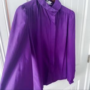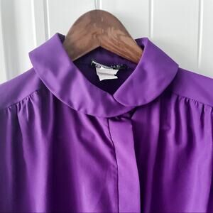 Gorgeous vintage rich purple Peter Pan collar blouse! Adorable darted shoulders and front seams. Unique offset covered button placket. Pearlescent purple cuff buttons. So cute! Made in the USA back in its day