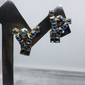 Vintage blue AB rhinestone statement glam clip on earrings.