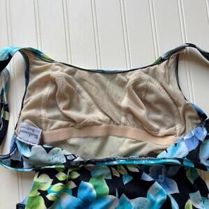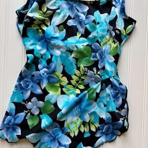 Vintage blue floral one piece bathing suit by Westbound Beach. Beautiful tropical blues and hibiscus flowers and greenery set on a black background with a ruffly tiny skirt like hem.