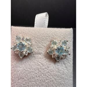 Genuine sky blue topaz and white cubic zirconia gemstones prong set in an authentic 925 sterling silver snowflake/ starburst / sunburst/ floral type design. Plastic disc ear backs are gold tone and not sterling silver or original to the earrings. Stamps on back are 925 THAILAND