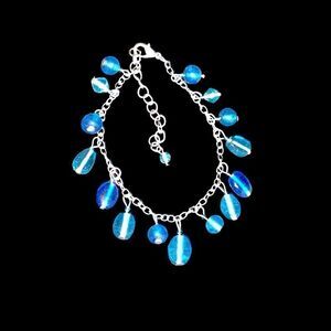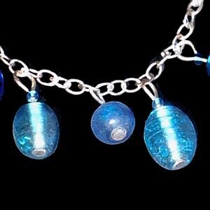 Really pretty vintage 90’s beaded dangling bracelet. The bracelet has beautiful bright blue glass pear shaped beads that dangle from the shiny silver chain, lobster claw closure. very adjustable, up to 9.75" Excellent condition. Please see all photos for full description.