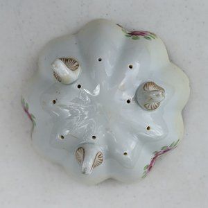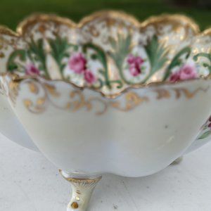 Beautiful bone china berry bowl strainer with 3 clawfoot feet.