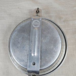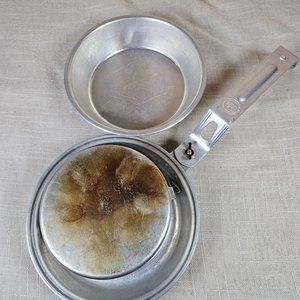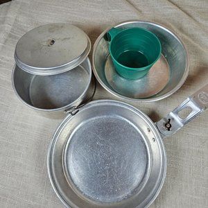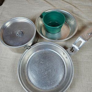 Aluminum pan, bowl, soup pot and a green plastic measuring cup. Markers mark says "Palco, Worchester Pressed Aluminum Corp, Worchester Mass". Also hand engraved with the scout's name, "K. Wrobel".