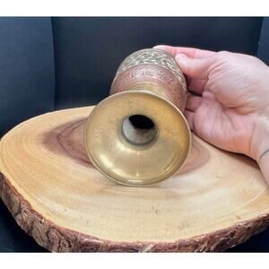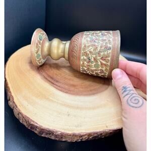 Vintage brass Pedestal Cup Etched with Enamel Floral Designs. A gorgeous display piece for home decor. Embrace the elegance of a bygone era with this vintage hand-carved bronze cup, a testament to the intricate artistry of 1970s India. The cup, with its rich bronze finish, is adorned with details that evoke the spirit of India, making it a unique addition to any decor. As an authentic antique, this miniature vase is not just a functional item but a work of art that can be a focal point in any room. The cup is suitable for display or could be used as a vessel, bringing a touch of artful sophistication to your space.