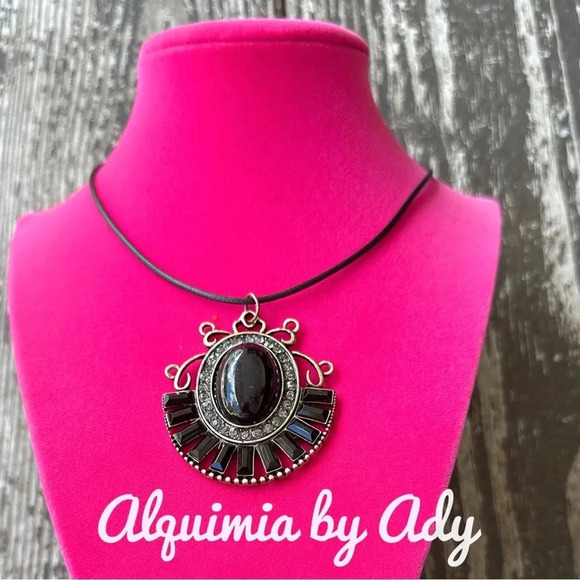 Vintage brass medallion crystal pave and resin black cord choker necklace