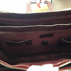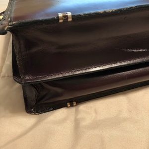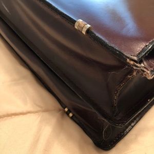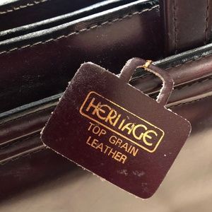 Vintage briefcase in mahogany leather. Shoulder strap included, handles retractable. Zipper closure on top of three separate compartments with smaller compartments within. Gold metal feet. A small scuff on one corner, see pic. Barely used and in excellent condition for its age. Not even broken in yet. Tag still on.