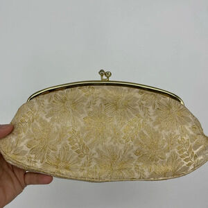 Gorgeous. Ivory fabric with gold stitching brocade. Gold colored clasp. Small inside stain and the tag has fallen off. 11 x 5.