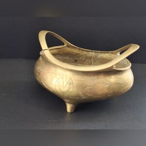 compressed bulbous form supported on three short tapering feet, flanked by a pair of handles on the rim, the base cast with a sixteen-character mark, with china under symbols.
