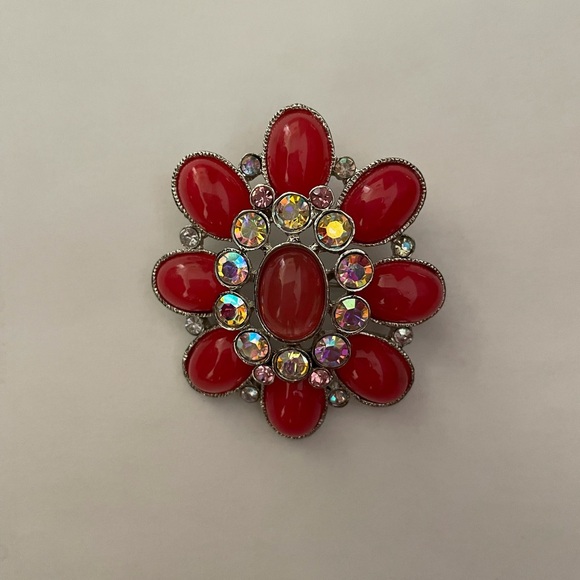 This gorgeous dome shaped, brooch features coral colored enamel oval shaped stones and aurora borealis round rhinestones. Set on silver tone background. Measurements shown in pictures.