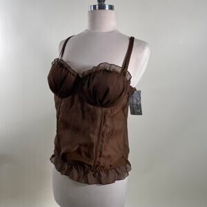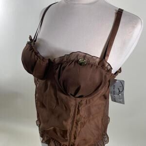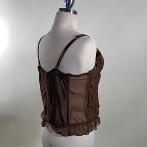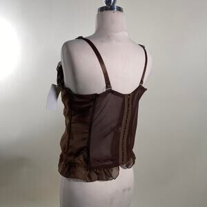 Vintage 2000s Y2K brown sheer corset by Diana secret. Has adjustable back and straps. Tagged a 2Xl but fits smaller so please read measurements beforehand for accuracy(measurements are based on tightest option on back of corset). Cup looks to fit a C cup