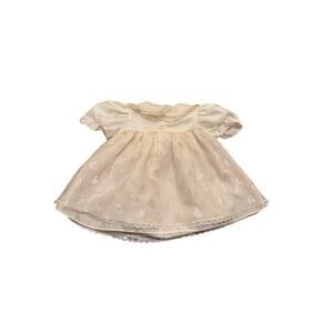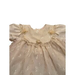 Beautiful vintage b.t. Kids infant special-occasion dress in a soft cream shade with satin puff sleeves, embroidered lace overlay, and delicate rosette appliqués.