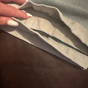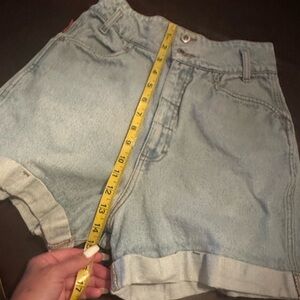 Super high rise with zipper and 2 buttons. Some distressing at cuff edges but otherwise great condition!