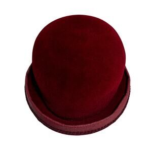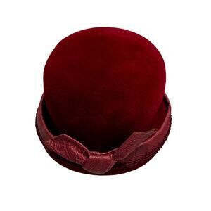 Vintage ladies hat - a burgundy red felted wool bucket style hat or bowler with a tightly rolled brim. The inside hatband reveals a Union Label. The hat is trimmed with faux leather and lace cord detail on the brim and a small bow at the back. There is some light discoloration on the inside band - probably makeup - but the remainder of this hat looks excellent - great color - as stylish today as it was back in the 1950's!