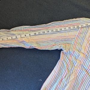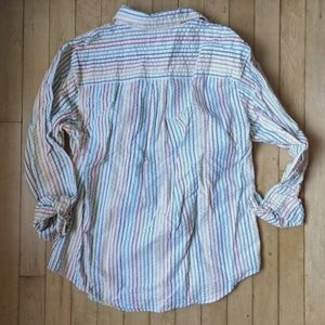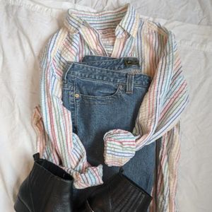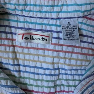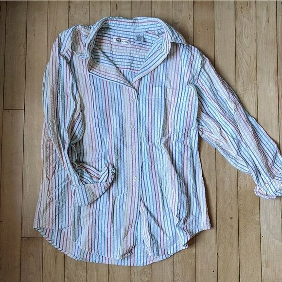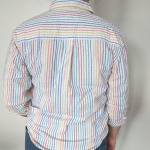 Talbot's striped button down. Has a slight crinkle texture, too. Fun bolder colors. Awesome with jeans!