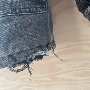 Vintage Carhartt Chore Coat in perfectly distressed condition. This is the kind of wear you can’t fake—raw edges, frayed cuffs, and a deep charcoal fade that gives it a rugged, broken-in feel. Tagged size is illegible, but fits like a boxy Large. Hefty canvas exterior, quilted lining, and a whole lot of character.